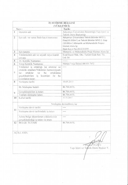 Adıyaman Üniversitesi Teknik Bilimler MYO Mimarlık ve Mühendislik Fakülteleri İş Bitirme Belgesi