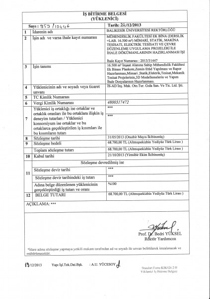 Iğdır Üniversitesi Ziraat Fakültesi ve 32 Daire Lojman Projeleri İş Bitirme Belgesi