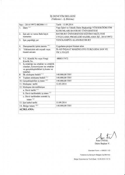 Abant İzzet Baysal Üniversitesi Gerede uygulamalı Bilimler MYO İş Bitirme Belgesi