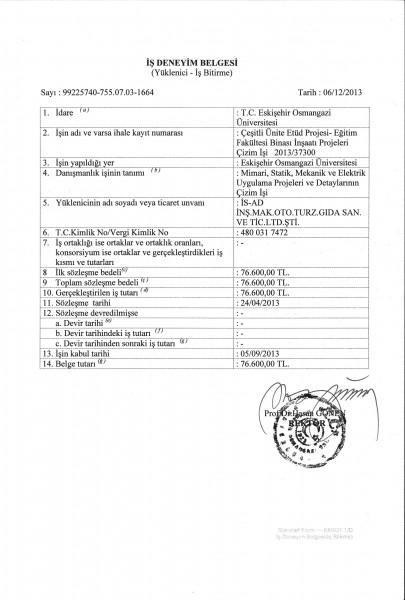 Eskişehir Osmangazi Üniversitesi Eğitim Fakültesi İş Bitirme Belgesi