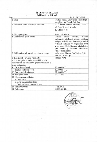 Hatay Mustafa Kemal Üniversitesi Mimarlık Fakültesi İş Bitirme Belgesi