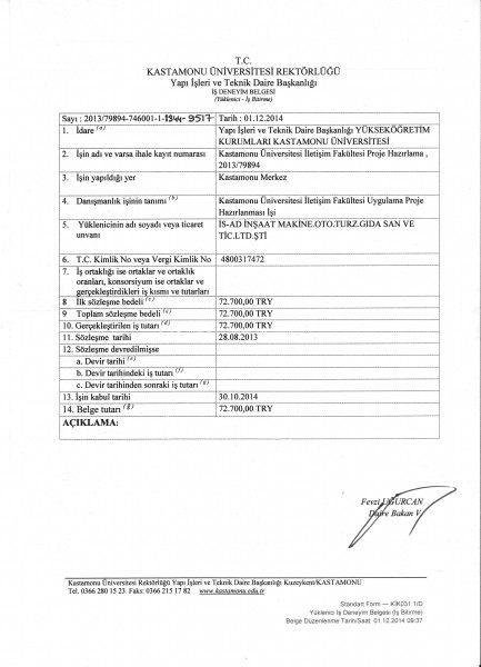 Kastamonu Üniversitesi İletişim Fakültesi İş Bitirme Belgesi