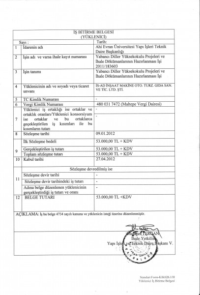 Kırşehir Ahi Evran Üniversitesi Yabancı Diller MYO İş Bitirme Belgesi